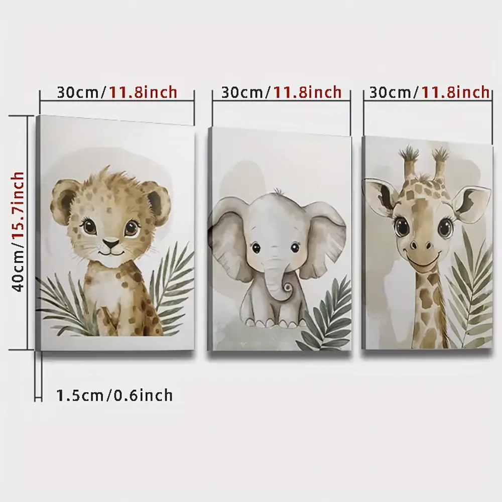 Το σετ περιλαμβάνει 3 πίνακες με λιοντάρι, ελέφαντας και καμηλοπάρδαλη, που ταιριάζουν τέλεια σε βρεφικά και παιδικά δωμάτια.