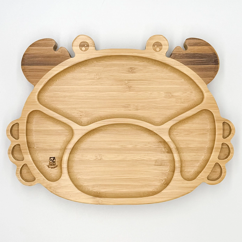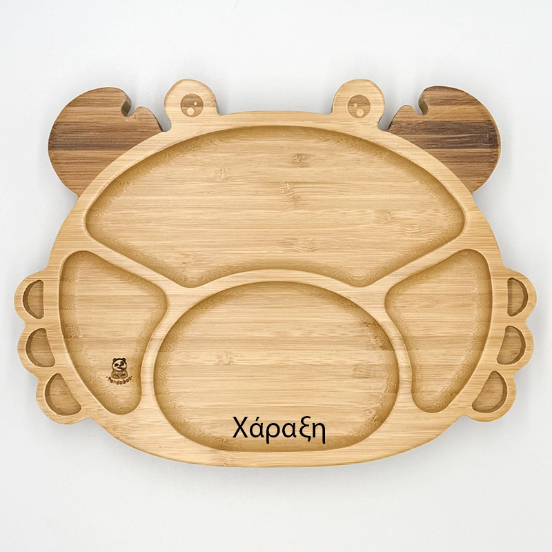 Πιατάκι μπαμπού με βεντούζα στήριξης Καβουράκι. Χωρισμένο σε 4 μέρη, τα δύο βασικά στο κέντρο για το κυρίως γεύμα και τα δύο πλαϊνά για συνοδευτικά. Αφήστε το παιδί σας να φάει μόνο του, να εξερευνήσει και να παίξει με το φαγητό του. Είναι ιδανικό για τη μέθοδο αυτοσίτισης baby-led weaning αλλά όχι μόνο.