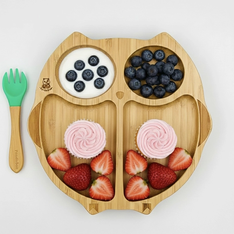 Πιατάκι μπαμπού με βεντούζα στήριξης Κουκουβάγια. Χωρισμένο σε 4 μέρη, τα δύο κεντρικά μεγάλα κατάλληλα για γεύμα όπως φασολάκια με μοσχάρι για να διαχωρίσετε αν θέλετε τα δύο υλικά και τα μάτια για συνοδευτικά. Αφήστε το παιδί σας να φάει μόνο του, να εξερευνήσει και να παίξει με το φαγητό του. Είναι ιδανικό για τη μέθοδο αυτοσίτισης baby-led weaning αλλά όχι μόνο.