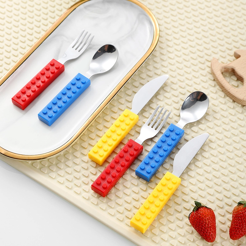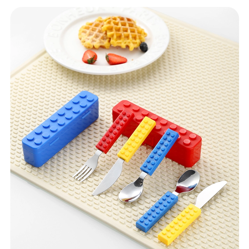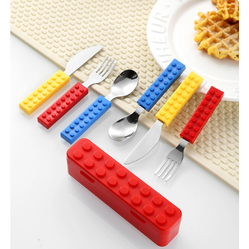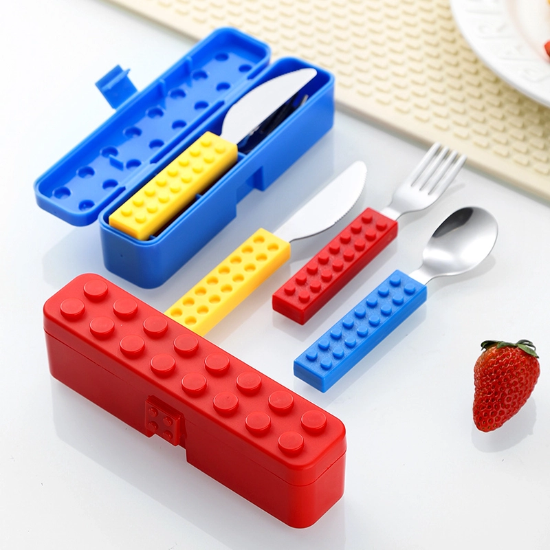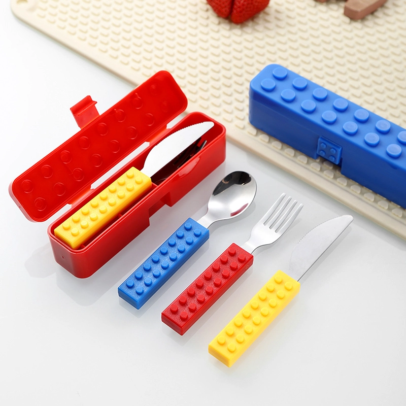 Το σετ περιλαμβάνει κουτάλι, πιρούνι, μαχαίρι και θήκη μεταφοράς, με σχέδιο τουβλάκια. Κάθε τεμάχιο έχει και διαφορετικό παιχνιδιάρικο χρώμα. Κατάλληλα για το σχολείο αλλά και για τη βόλτα.